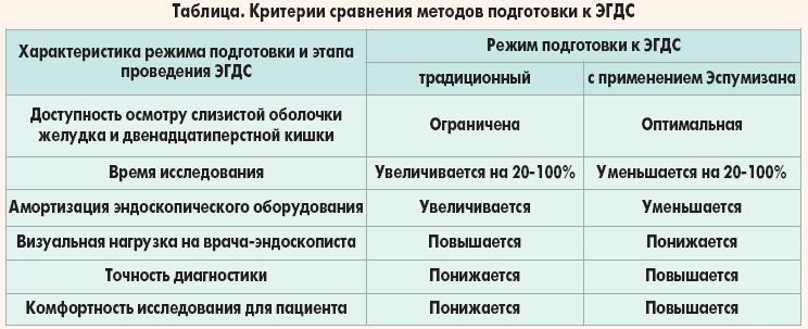 Анализ результатов собственного исследования и данных литературы позволили нам сформулировать критерии сравнения традиционной подготовки к ЭГДС и с применением капсульной формы Эспумизана.