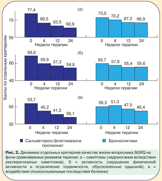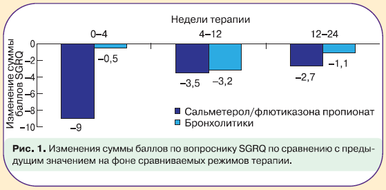 Проанализировав полученные результаты, исследователи установили, что применение Серетида сопровождается быстрым (в течение первых 4 нед терапии) и выраженным улучшением качества жизни больных ХОБЛ по сравнению с терапией бронхолитиками (рис. 1 ).