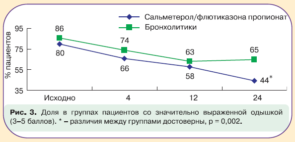 Улучшение качества жизни у пациентов, получавших Серетид, сопровождалось улучшением клинической картины ХОБЛ и в первую очередь уменьшением выраженности одышки – основного и наиболее беспокоящего симптома ХОБЛ. К окончанию исследования терапия Серетидом позволила уменьшить долю пациентов, у которых одышка была значительно выраженной (3-5 баллов), почти в 2 раза – с 80 до 44%. В группе, получавшей только бронхолитики, доля таких больных составила 63% к 12-й неделе лечения и дальнейшего снижения этого показателя не наблюдалось (рис. 3).