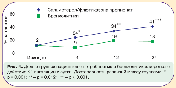 На фоне терапии Серетидом также наблюдалось снижение потребности в бронхолитиках короткого действия. В сравнении с группой больных, применявших только бронхолитики, в группе Серетида пациентов, использовавших β2-агонисты короткого действия реже чем 1 раз в сутки, было значительно больше уже через 4 нед лечения (рис. 4).
