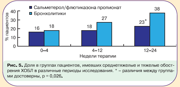 Одним из наиболее значимых результатов исследования ИКАР-ХОБЛ является снижение частоты среднетяжелых/тяжелых обострений ХОБЛ при применении комбинированного препарата салметерол/флутиказона пропионат. В течение второй половины лечебного периода (12-24-я недели) обострения ХОБЛ были зарегистрированы у 23% пациентов, получавших Серетид, и у 38% в группе сравнения (р=0,026; рис. 5).