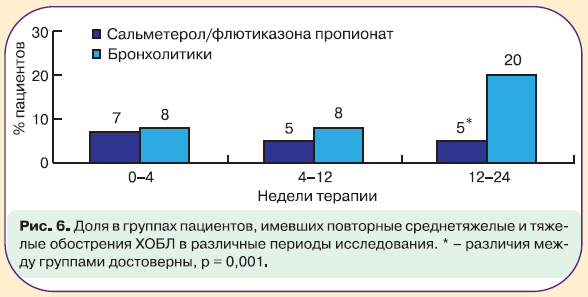 Еще более выраженные различия между группами были обнаружены при анализе частоты повторных среднетяжелых/тяжелых обострений ХОБЛ (рис. 6).